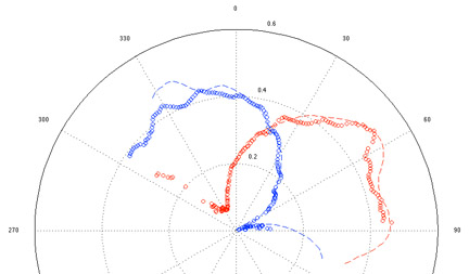 Above: Example of Antenna Pattern from a Chesapeake Bay SeaSonde as measured using AIS-Enabled AUTO-APM software (o) vs. that measured using a transponder (--). Auto-APM data was collected over several days. |